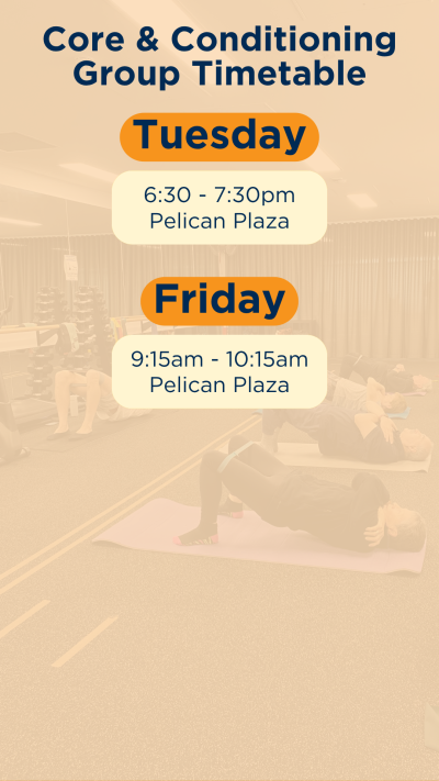 All of our Core & Conditioning classes are 60 minutes long at Pelican Plaza.